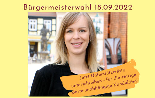 Seit 14 Tagen ist der Wahltermin für die Bürgermeisterwahl in Perleberg nun offiziell. Es wird für mich ernst, denn als parteiunabhängige Kandidatin benötige ich bereits jetzt die Unterstützung der Perleberger Wähler, um als Kandidatin zur Wahl zugelassen zu werden. Die Unterstützerliste liegt im Ordnungsamt aus.